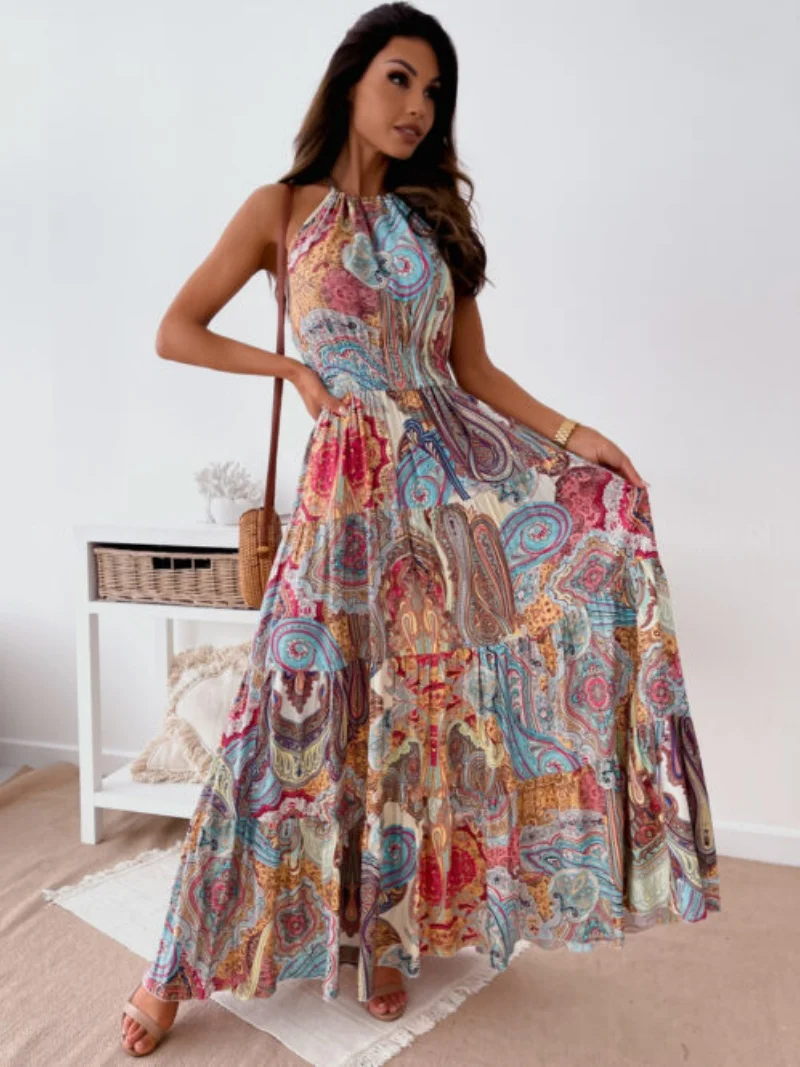 This bohemian floor-length dress is designed to bring effortless elegance and freedom of movement to your wardrobe. Made from smooth, lightweight polyester jersey fabric, it flows beautifully with every step while offering a comfortable regular fit. The sleeveless silhouette and unique backless detail add a touch of charm and femininity, making it perfect for both casual days and special occasions.